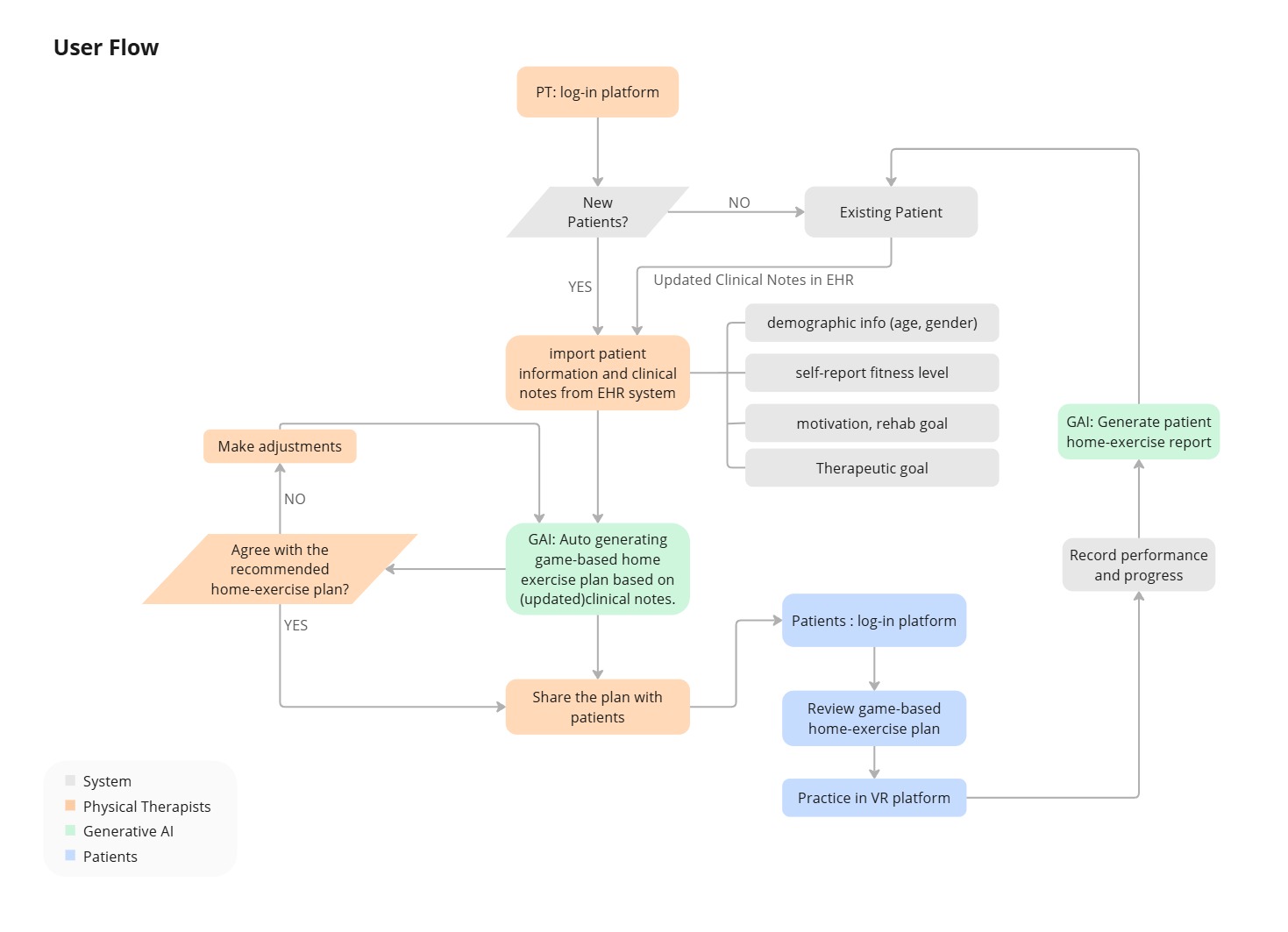 To create a gamified home exercise platform combined with GAI to auto generate customized home exercise plans and rehabilitation games for patients based on clinicians' notes. In this way, I expect this platform can accelerate physical therapists’ workflow in putting together the home-exercises that are tailored to patients and it gives physical therapists access to monitor patients’ home exercise progress when out of the clinics. For patients, the gamified rehabilitation exercises are tailored to the patient's goals and interests, with the interactions and feedback from the game, all together may enhance their motivation for completing the exercises at home.